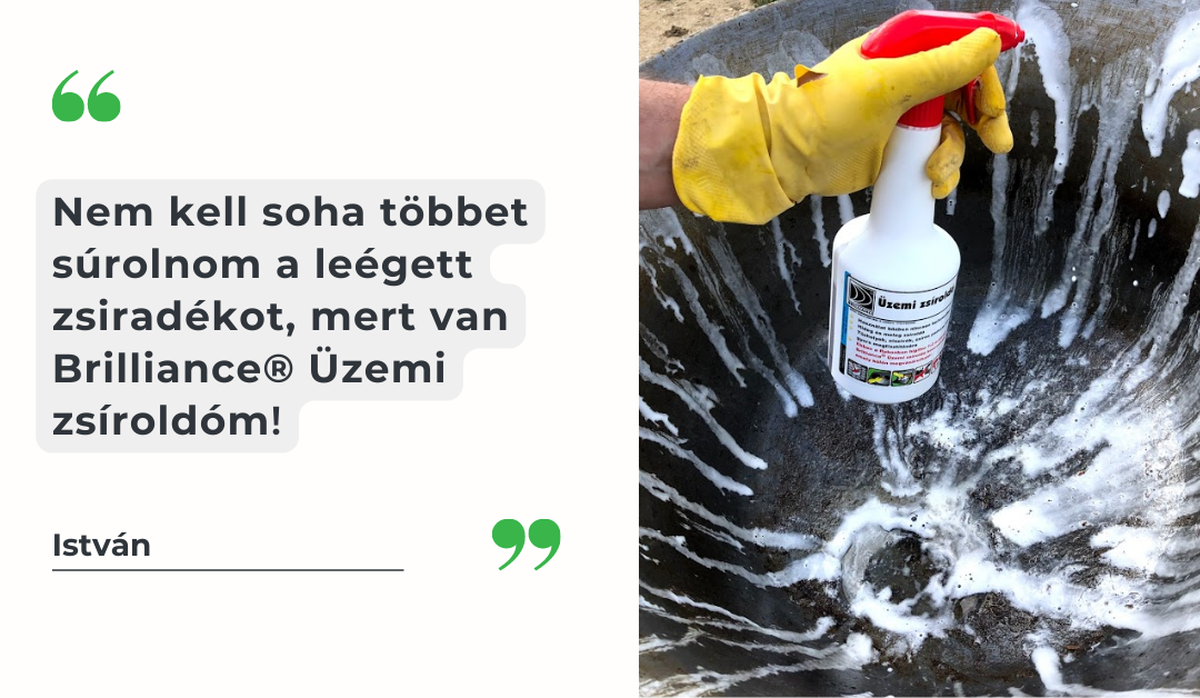 Szerencsére nem kellett vakargatni, és súrolni, mert a Brilliance® Üzemi zsíroldó befújtam, vártam kb 10 percet, majd szivaccsal kimostam alaposan. Tökéletesen tiszta lett, akár új korában! Nem hittem a szememnek, hogy a Brilliance Üzemi zsíroldó szuperkoncentrátum még a fél éves zsíros maradványokkal is elbánik!