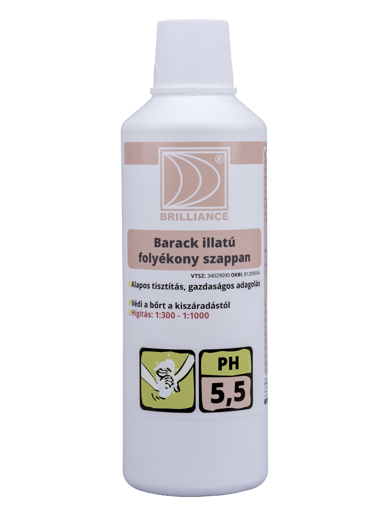 A Brilliance® Barack illatú folyékony szappan alaposan tisztítja a bőrt, egyben védi a kiszáradástól és visszajuttatja a bőr elveszett zsírtartalmát. A termék töménysége miatt gazdaságosan adagolható és ezért sokáig tart.