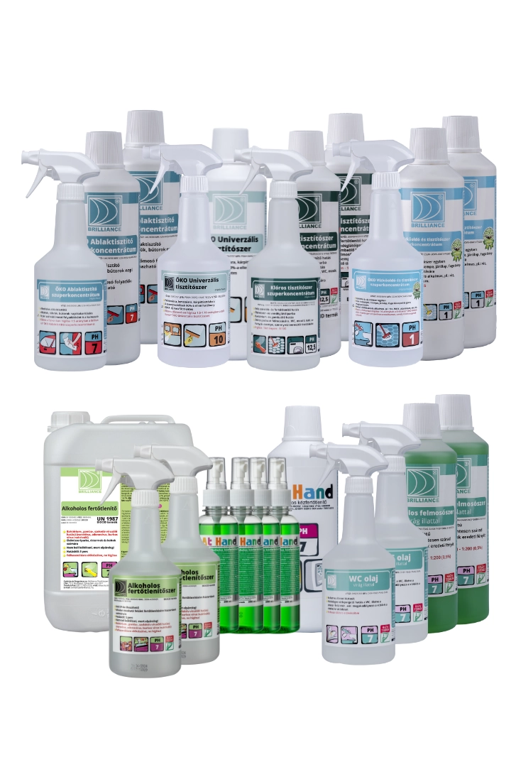 • WC deszka fertőtlenítés – 2 db Brilliance® Alkoholos fertőtlenítő 0,75 liter + 1 db 5 literes utántöltő